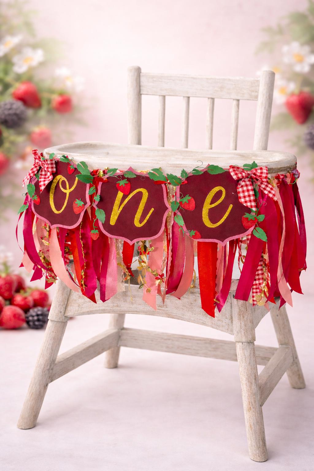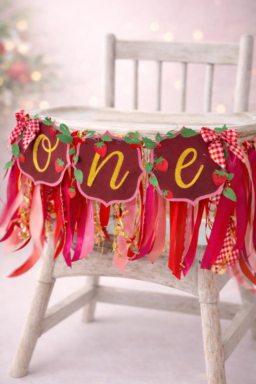 Make her first birthday photo extra sweet with this berry first birthday high chair banner, handmade with bright strawberry ONE decor that pops on camera.
