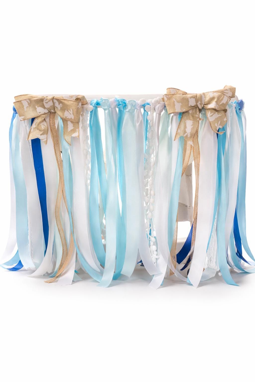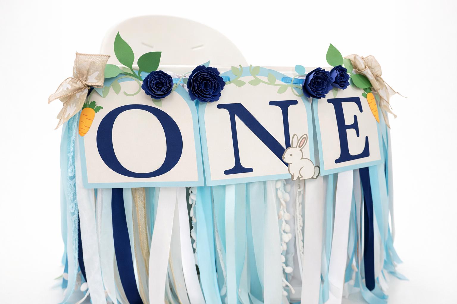 Featuring bold navy lettering spelling ONE, sweet bunny accents, carrots, greenery, and handcrafted paper florals, this banner brings a whimsical garden feel to your celebration. Cascading satin, lace, chiffon, and textured ribbons create beautiful movement and dimension — making photos extra dreamy and memorable.