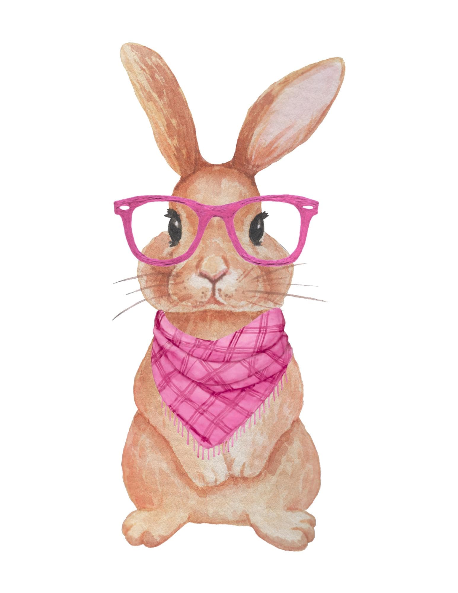 Soft, warm brushstrokes shape velvety tan fur, tall ears, and a curious little nose, while the bold frames give this bunny portrait a clever, classroom-cute vibe. Choose the look you love: a hot-pink bow with pink glasses, a pink plaid bandana, or a blue bandana with matching blue glasses, each on a clean white background that feels light and modern. The colors read crisp and cheerful, perfect for a nursery print, kids room decor, playroom wall art, or a whimsical gallery wall. This printable bunny art is designed to look fresh in a simple frame, sweet on a shelf, and delightful as Easter decor or year-round animal art. Add it to a reading nook, teacher classroom decor, or a baby shower gift bundle for an instantly bright, friendly focal point. As a digital download, it’s an easy way to refresh your space in minutes with printable wall art you can use again and again.