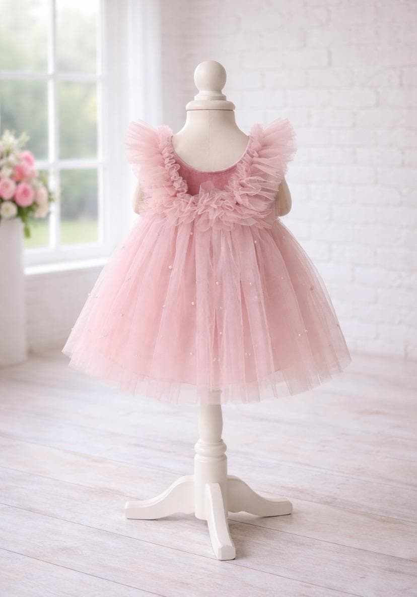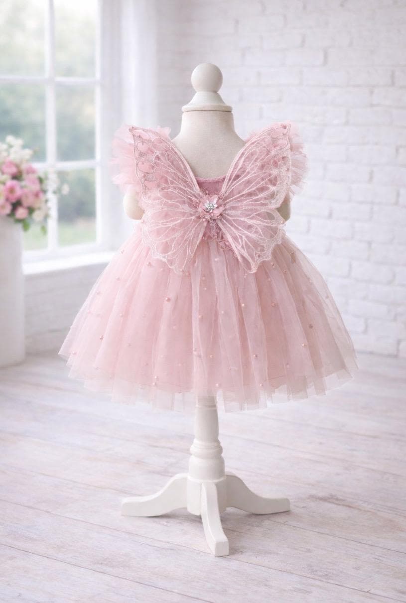 This soft blush pearl-embellished dress features layered tulle, delicate ruffle shoulders, and attached embroidered butterfly fairy wings with a sparkling rhinestone floral center. The winged back creates a stunning statement, perfect for garden weddings, flower girls, first birthday photos, fairy parties, and heirloom keepsakes.