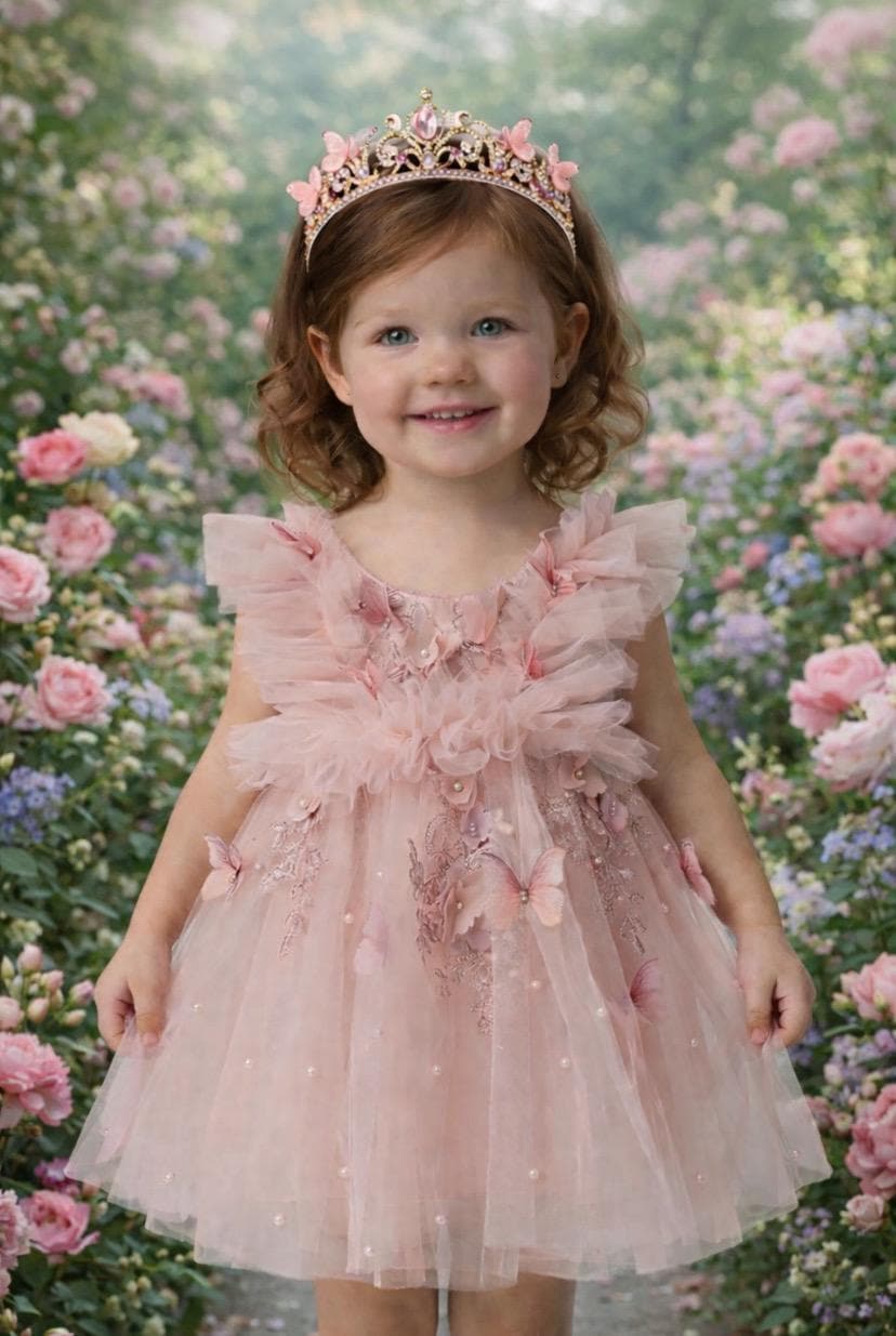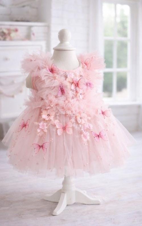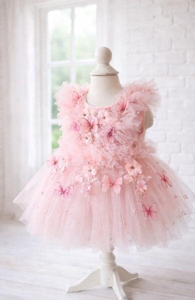 Designed to photograph beautifully in natural light or studio settings, this pink butterfly dress brings a whimsical, luxury touch to any special occasion.